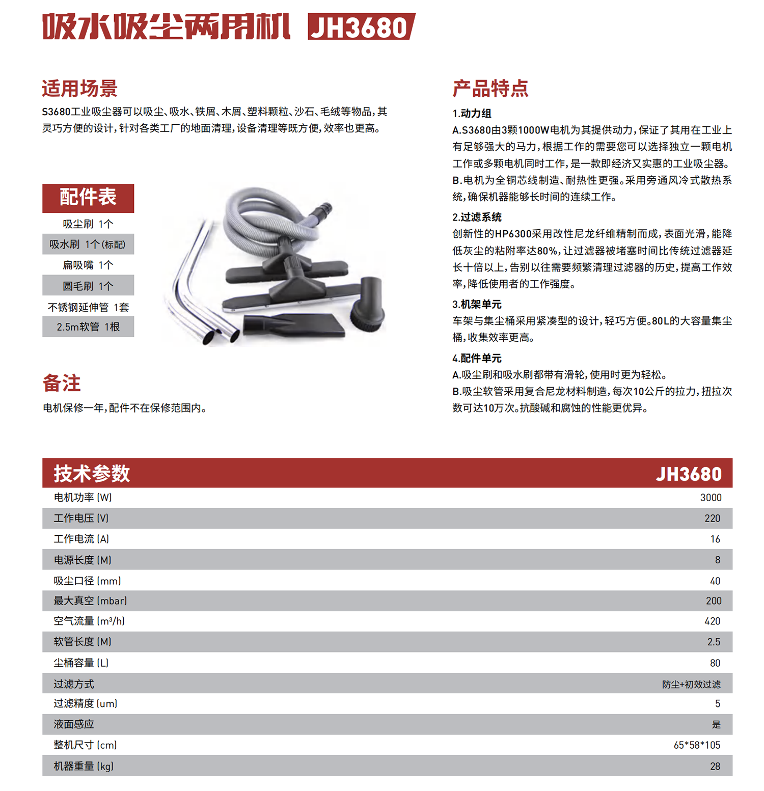 S3680工業吸塵器可以吸塵、吸水、鐵屑、木屑、塑料顆粒、沙石、毛絨等物品,其靈巧方便的設計,針對各類工廠的地面清理,設備清理等既方便,效率也更高。